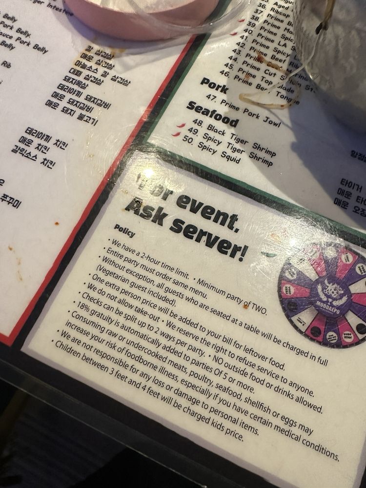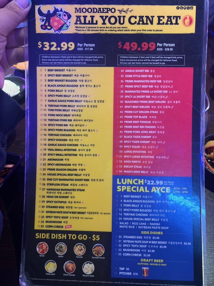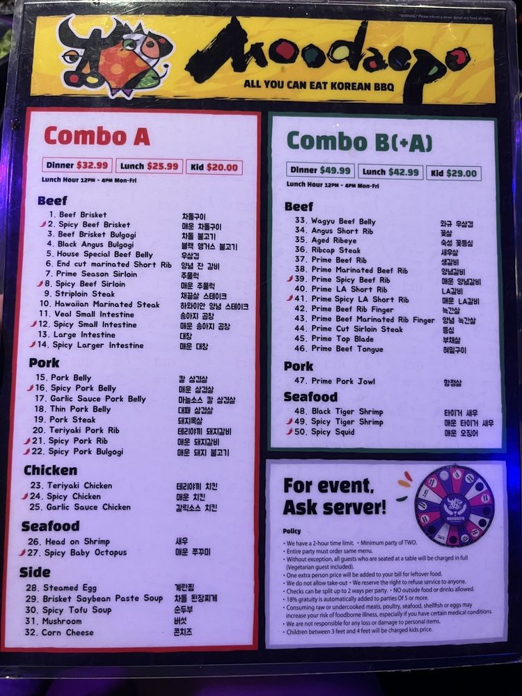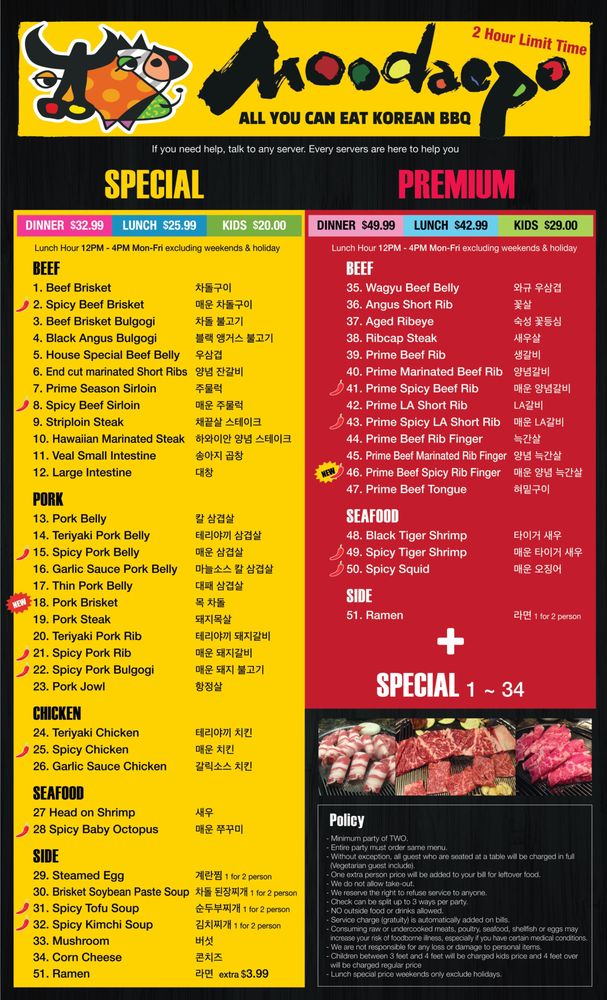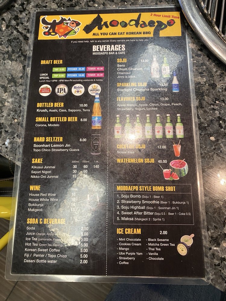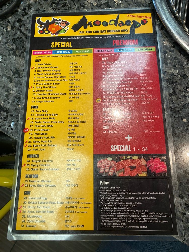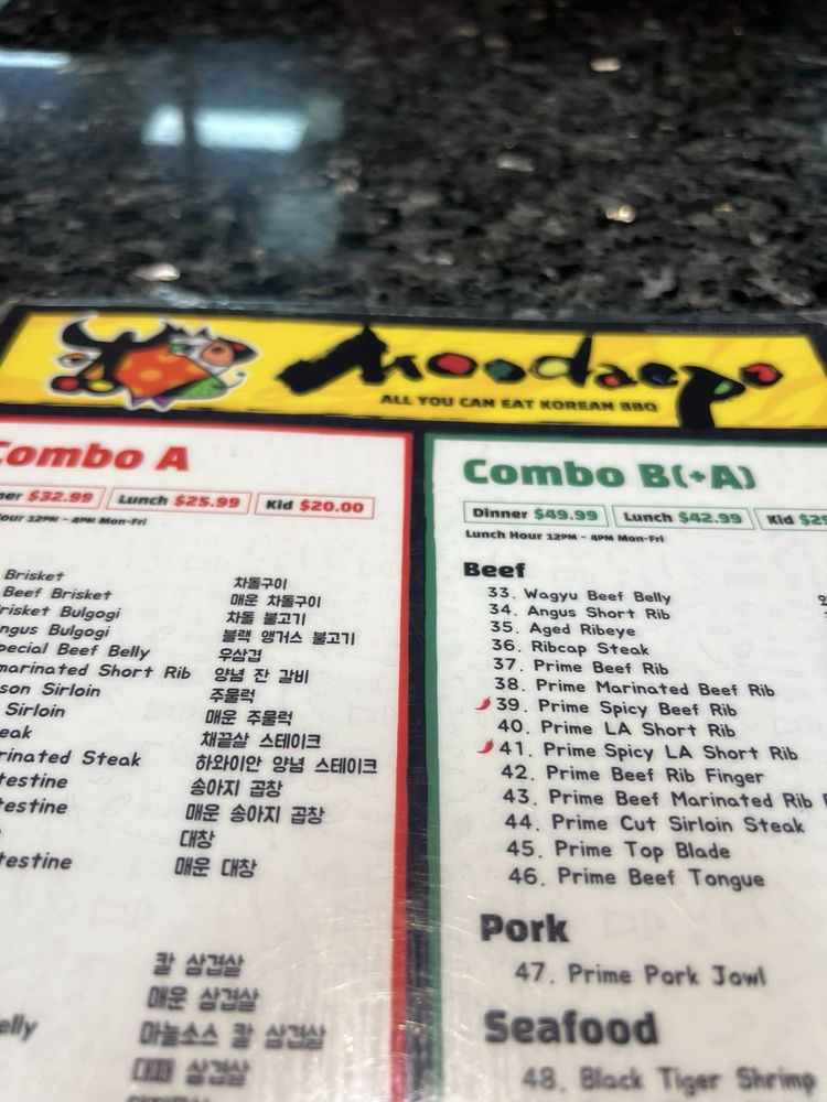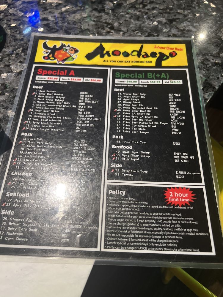 "Introducing the menu at Moodaepo, a popular Korean barbeque restaurant located in Los Angeles. Known for their delicious grilled meats and vibrant atmosphere, Moodaepo offers a variety of options for meat lovers. With amenities such as outdoor seating, valet parking, and happy hour specials, this restaurant is perfect for group gatherings or a fun night out. The restaurant also caters to those looking for a casual dining experience, with options for both indoor and outdoor seating. Moodaepo is a great choice for anyone looking to enjoy traditional Korean flavors in a lively setting. Don't miss out on trying their signature dishes and experiencing the unique dining experience at Moodaepo."